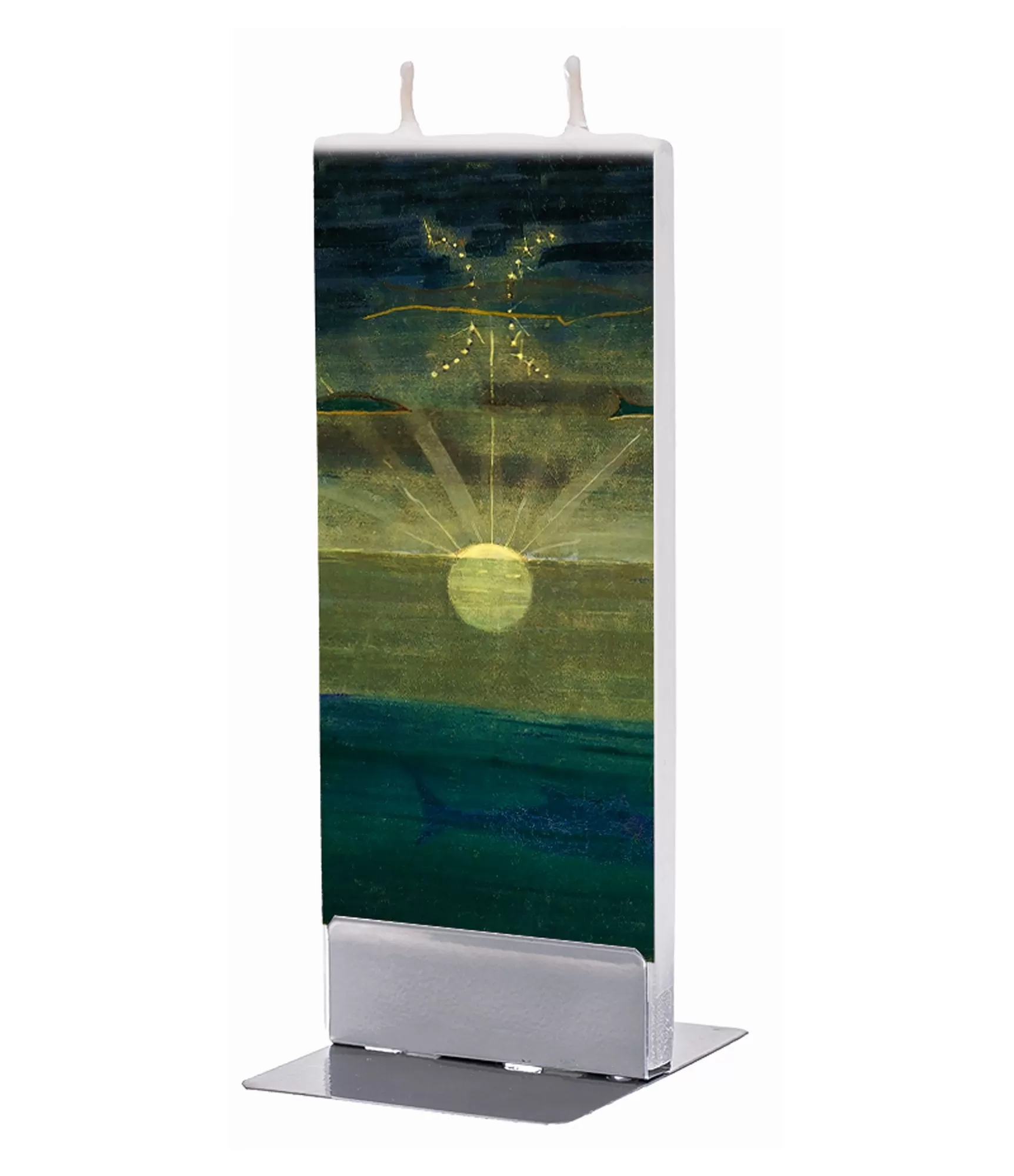 Plokščia žvakė "Zodiakas Žuvys Čiurlionis 12" yra subtili odė M. K. Čiurlionio kūrybiniam genijui, paverčianti kambarį savotiška ramybės galerija. Rankų darbo gaminys, įkvėptas ciklo "Zodiakas", pasižymi grakščiu, plokščiu siluetu, kuris šiuolaikiniam interjerui suteikia intelektualios prabangos pojūtį. Originali žvakė turi dvi medvilnines dagtis bei stabilų plieninį padėkliuką, leidžiantį saugiai stebėti šviesos žaismą iki 4 valandų.